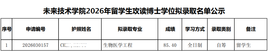 经北京大学研究生院审核批准,北京大学未来技术学院2026年“申请-考核制”留学生攻读博士学位拟录取公示名单,特此公示。