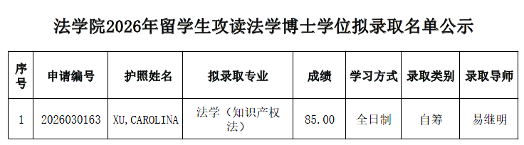 经北京大学研究生院审核批准,现公布我院2026年招收留学生攻读法学博士学位拟录取名单。名单自即日起公示7日,如有异议,请在公示期内提出。