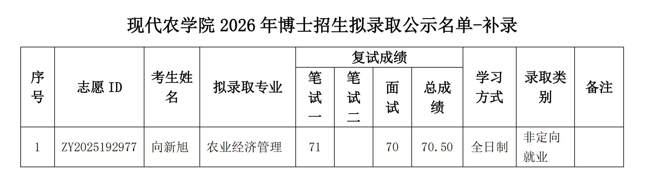 根据《北京大学2026年博士研究生招生简章(校本部)》要求,经现代农学院综合考核并报研究生院审核批准,现代农学院2026年博士研究生补录名单公示如下: