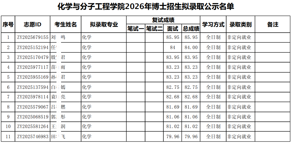 经北京大学研究生院审核批准,现公示2026年北京大学化学学院申请-考核制博士生,及化学学院2026年留学生博士生拟录取名单。