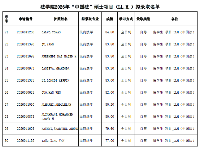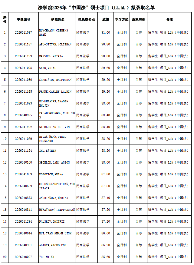 2026年北京大学法学院“中国法”硕士项目(LL.M.)拟录取公示名单