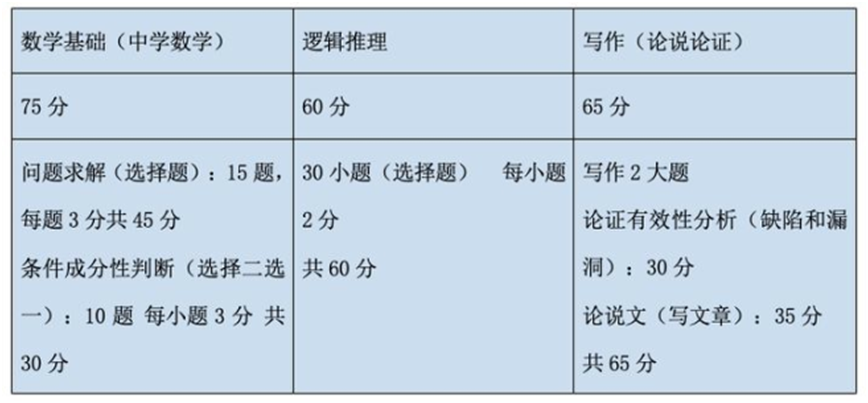 管理类联考包含了外国语和199管理类联考综合两个科目,其中管理类联考综合试卷包含初等数学、逻辑推理、写作(论证有效性分析、论说文)共三部分,提醒借鉴了美国GMAT考试(美国经企管理研究生入学考试)。试卷满分200分,考试时间为180分钟,答题方式为闭卷、笔试,且不允许使用计算器。题型分值如下表所示: