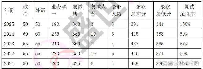 2025年的录取情况显示,政治、外语单科分数线均为50分,专业课分数线为180分,复试总分数线为340分。当年进入复试3人,全部被录取,最高分391分,最低分341分,录取率达到100%。