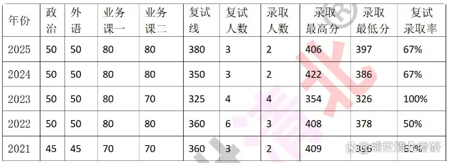 • 2022年:各科单科线与2025年一致(政外50,业务课80)。复试总分线为360分。复试6人,录取3人,录取最高分408分,最低分378分,复试录取率为50%。