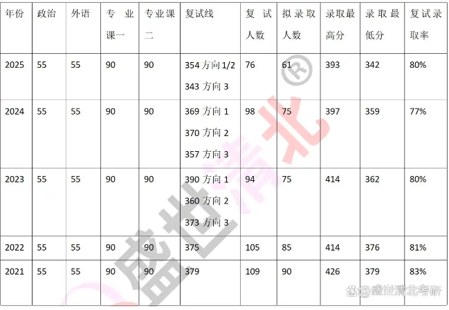政治和外语的单科分数线均为 55 分,专业课一和专业课二的单科分数线都是 90 分。不同方向的复试线有所不同,方向 1 和方向 2 的复试线为 354 分,方向 3 的复试线为 343 分。进入复试的人数是 76 人,拟录取人数为 61 人,录取最高分达到 393 分,录取最低分是 342 分,复试录取率为 80%。