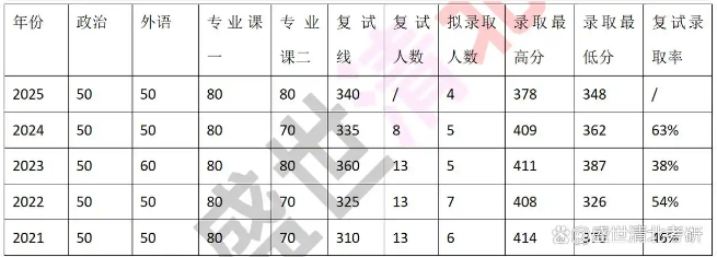 从近五年的数据来看,进入复试的最低分和最高分存在一定范围。复试最低分在 310 - 360 分之间波动,其中 2021 年最低,为 310 分;2023 年最高,为 360 分。而最终录取的最低分和最高分范围则更广,录取最低分在 326 - 378 分之间,录取最高分在 370 - 414 分之间。