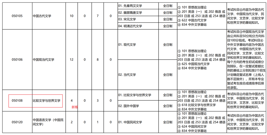 新增比较文学与世界文学专业,设立2个研究方向,首年统招计划仅1人