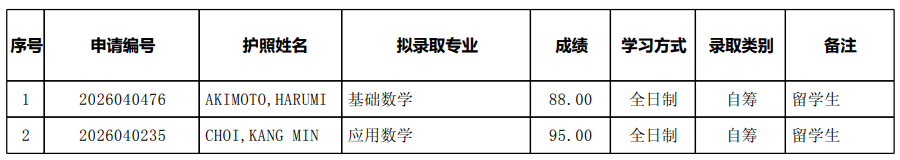 以下为数学科学学院2026年留学生硕士招生拟录取公示名单,此名单自即日起公示7日。