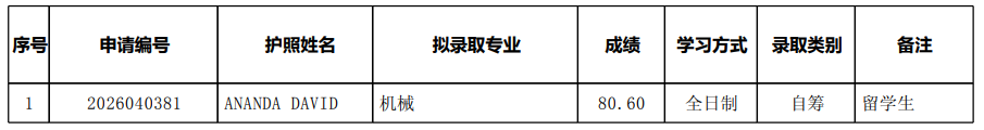 现将先进制造与机器人学院2026年机械硕士招生拟录取名单(留学生)公示,此名单自即日起公示7日。