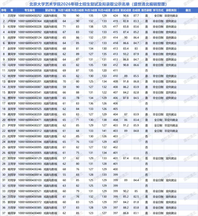 北京大学艺术学院2026年硕士招生复试及拟录取名单近日公布。戏剧与影视专业375分压线入围,378分考生成功上岸;全日制实际录取10人,较计划扩招1人;非全日制录取60人,与计划持平。复试50%的权重,让低分考生有了翻盘机会,也让高分考生面临更大挑战。