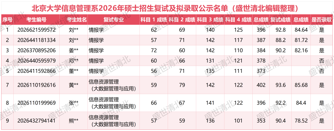 北京大学信息管理系2026年硕士招生拟录取名单近日公布。在情报学与信息资源管理两个专业的录取中,情报学竞争激烈、高分稳录;信息资源管理等额录取、353分复试最低分也能成功上岸等案例引发广泛关注。