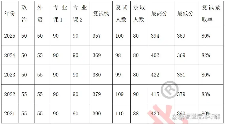 从整体分数线来看,2021年至2025年间,各单科分数线基本保持稳定。政治科目除2025年为50分外,其余年份均为50或55分;外语在2025年为50分,其他年份均为55分;两门专业课近五年均稳定在90分。然而,复试总分线波动较为明显,2021年高达390分,2022年和2023年分别为379分和380分,2024年升至369分,2025年进一步下降至357分。这表明虽然单科门槛变化不大,但竞争强度在不同年份有所差异,考生需统筹各科复习,尤其要重视专业课的积累,尽早准备,科学规划。