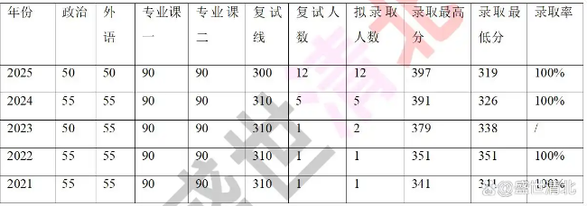 从复试和录取的分数情况来看,近 5 年中,复试的最低分是 300 分(2025 年),最高分是 310 分(2021 - 2024 年)。这表明考生若努力将分数考到 300 - 310 分之间,就有较大的机会进入复试环节。而在录取方面,最低分是 319 分(2025 年),最高分是 397 分(2025 年)。这意味着考生若能将分数提升至 319 - 397 分这个区间,就有很大的可能性被录取。当然,分数越高,录取的把握也就越大,考生应以此为目标,全力以赴提升自己的成绩。