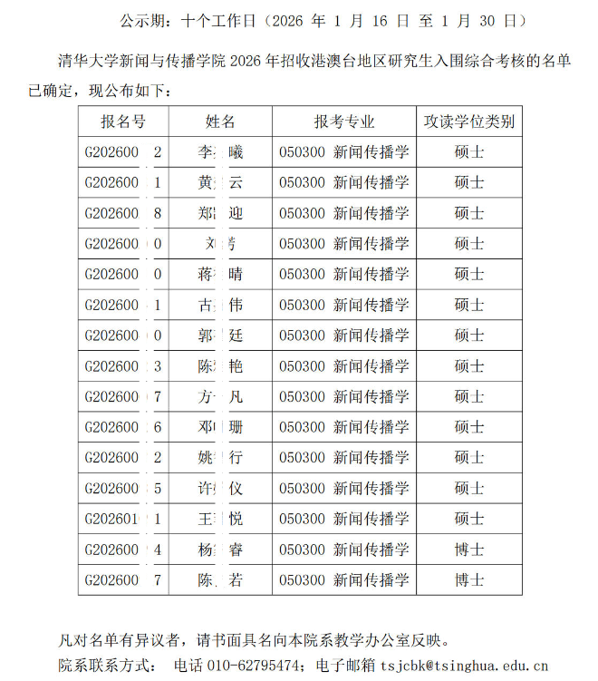 以上是关于【2026年清华大学新闻与传播学院招收港澳台地区研究生综合考核名单公示】的内容,希望能帮助准备考研清北的同学们节约时间,提高上岸的成功率。