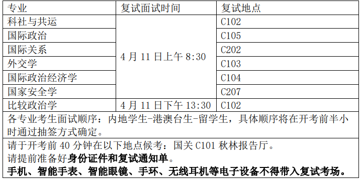 五、复试前资格审核办理时间及地点:2026 年 4 月 10 日(周五)上午 8:30-11:30,国际关系学院 A108 房间。不能提交原件、材料提交不全或未按时完成资格审核者视为资格审核不通过,不能参加复试。