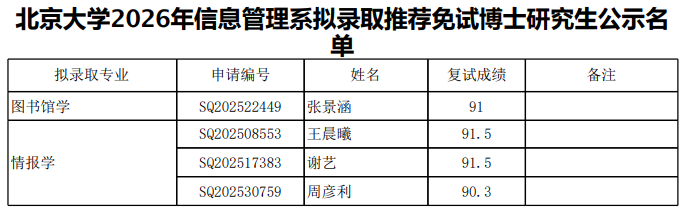 以上是关于【2026年北京大学信息管理系博士招生拟录取公示名单】的内容,希望能帮助准备考研清北的同学们节约时间,提高上岸的成功率。