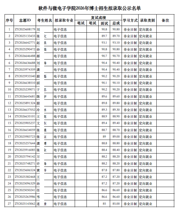 经北京大学研究生院审核批准,软件与微电子学院2026年“前沿工程博士专业学位”电子信息类别工程博士拟录取名单,特此公示。