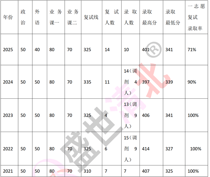 近五年招录数据显示,该专业单科线(政/外/业一/业二)总体稳定在50/40-50/80/70分。总分要求从2021年的310分逐步升至2024年的335分,2025年略回调至325分,呈现“稳中有升、偶有波动”的趋势,这意味着初试应力争高分,以稳获复试资格。