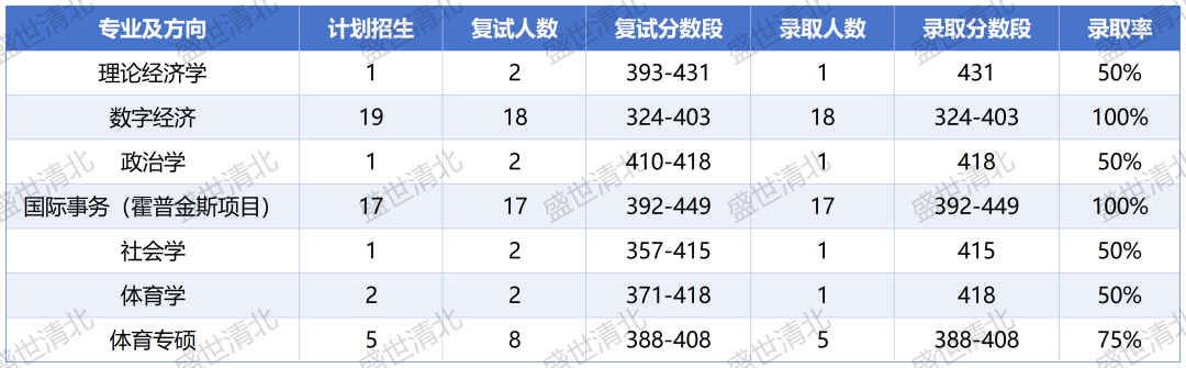 从录取数据看,数字经济方向和国际事务方向全员录取,理论经济学、政治学、社会学、体育学等学术型方向录取率50%,初试定资格,复试定结果,每一位进入复试的考生都有机会通过出色的复试表现成功上岸。