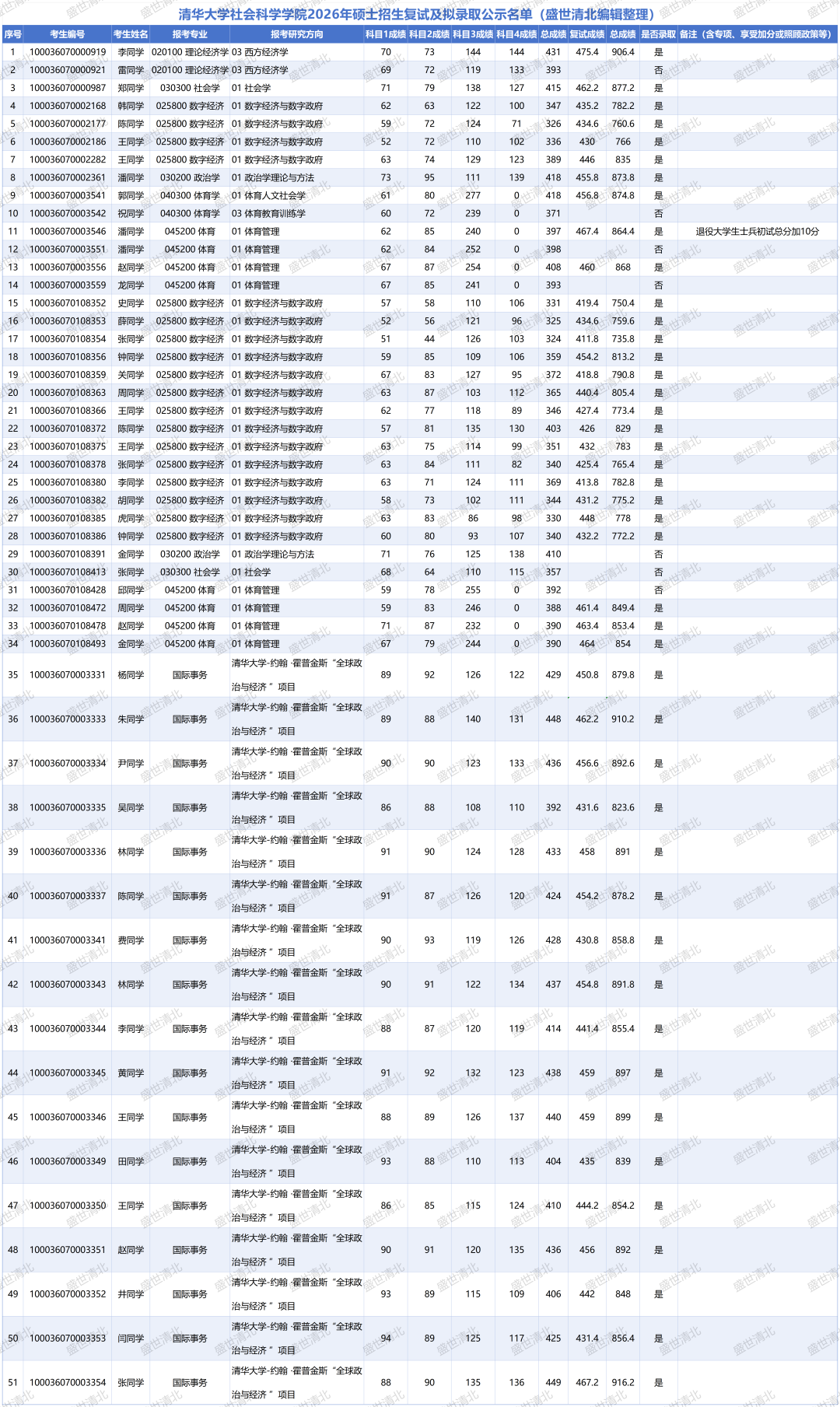 说明: 以上数据源自清华大学社会科学学院官网公布的2026年硕士招生复试分数线及拟录取名单,由盛世清北编辑整理。如有疏漏,欢迎指正。