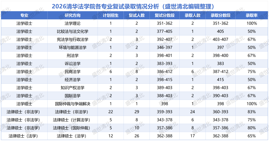 以下为2026年清华法学院各专业方向招生、复试及录取情况汇总: