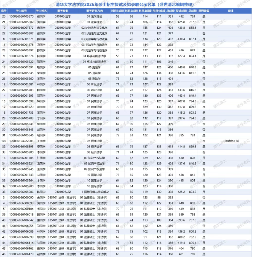 备注说明: 以上数据源自清华大学法学院官网公布的2026年硕士招生复试分数线及拟录取名单,由盛世清北编辑整理。如有疏漏,欢迎指正。