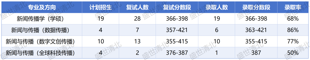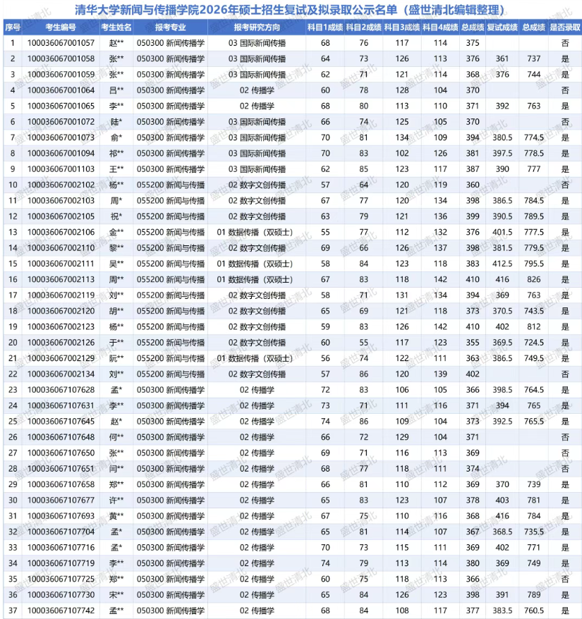 备注说明: 以上数据源自清华大学新闻与传播学院官网公布的2026年硕士招生复试分数线及拟录取名单,由盛世清北编辑整理。如有疏漏,欢迎指正。