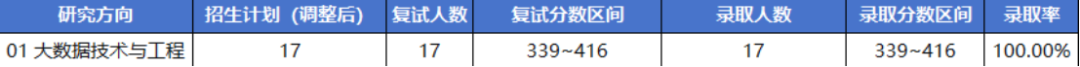 该项目计划招生17人,实际复试17人,录取17人,录取率达100%。复试分数区间为339——416分,录取分数区间相同。初试最高分416分与最低分339分的考生均被录取,说明在初试达到要求的前提下,只要复试正常发挥,便有机会成功上岸。整体来看,该项目对初试过线考生比较友好,但复试环节仍然需要认真对待——初试成绩提供了进入复试的基础,复试表现则确保总成绩稳步达标。