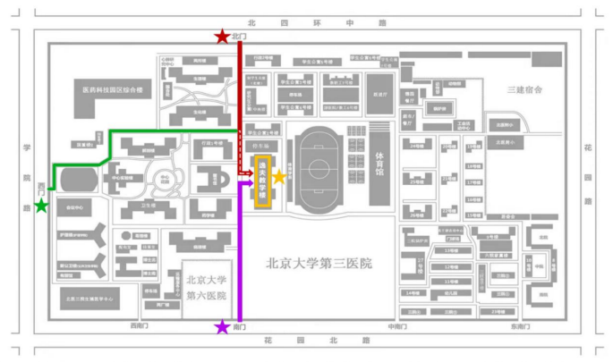 考试期间,医学部将为考生开放北门、西门和南门作为入场通道,每日入校通道开启时间为早 6:45。建议考生从北门或南门进入,北门、南门距逸夫教学楼的距离分别为 300 米、200 米,预计步行时间 4 分钟左右。考生务必提前到达指定校门,开考 15 分钟后不得进入考点。距离医学部最近的地铁站为昌平线-学院桥站(C2 口),步行至医学部北门的时间大约为 15 分钟。北门附近设有公交站-学院桥东站,步行至医学部北门的时间大约为 5 分钟。