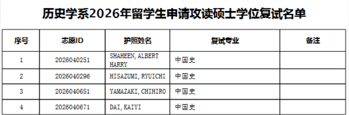 根据《北京大学2026年外国留学生研究生招生简章(校本部)》和《北京大学历史学系2026年博士研究生申请-考核制招生说明》的规定与要求,经过严格审核,决定同意以下留学生考生参加北京大学历史学系2026年硕士、博士研究生复试: