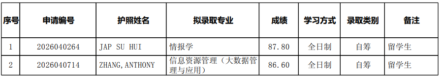 经北京大学研究生院审批,信息管理系公示2026年留学生硕士招生拟录取名单,名单自即日起公示7日,如有异议,请将问题实名发送至:gxgzs@pku.edu.cn。