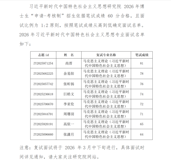 以上是关于【2026年北京大学习近平新时代中国特色社会主义思想研究院“申请——考核制”博士研究生招生复试面试通知及细则】的内容,希望能帮助准备考研清北的同学们节约时间,提高上岸的成功率。