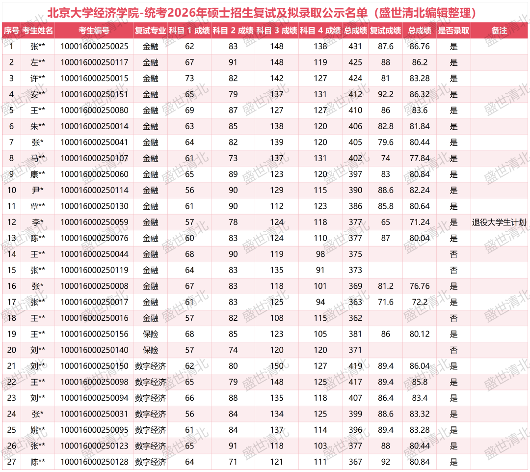 北京大学经济学院2026年硕士招生拟录取名单近日公布。在金融、保险、数字经济三个专业的录取中,数字经济等额录取全员上岸、金融363分压线考生成功逆袭、退役大学生计划377分录取等案例引发广泛关注。