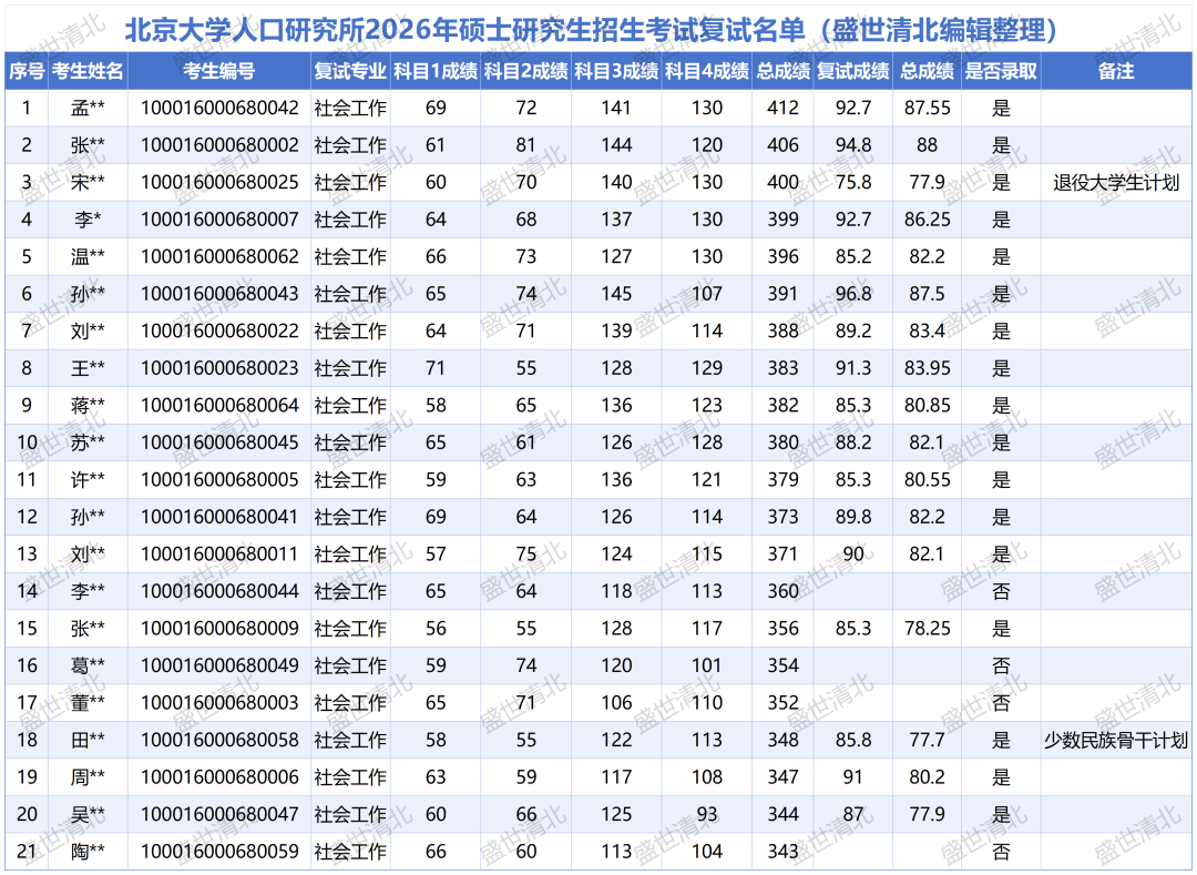 说明:以上数据源自北京大学人口研究所官网公布的复试分数线及拟录取名单,由盛世清北编辑整理。如有疏漏,欢迎指正。
