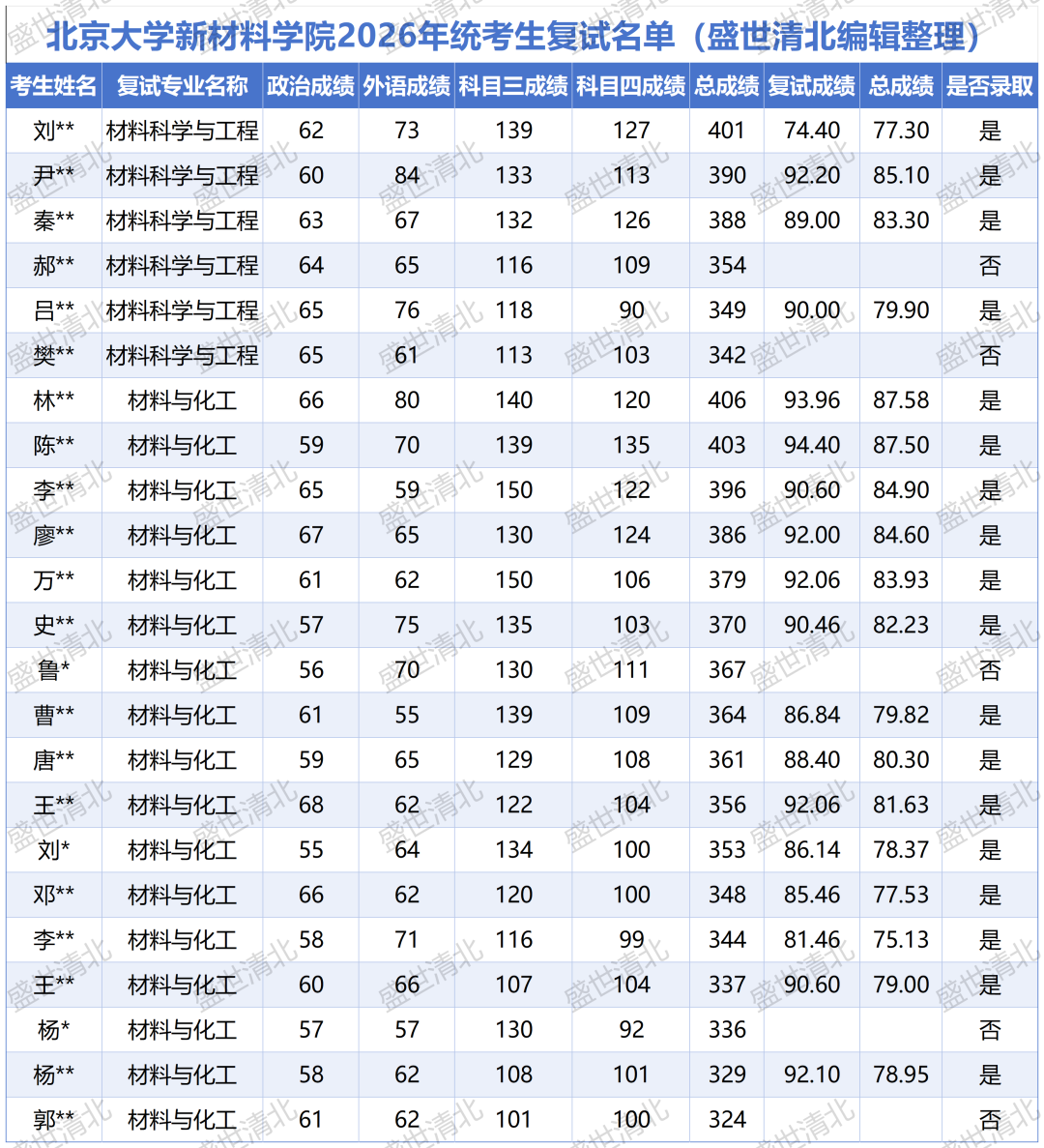 说明:以上数据源自北京大学新材料学院官网公布的复试分数线及拟录取名单,由盛世清北编辑整理。如有疏漏,欢迎指正。