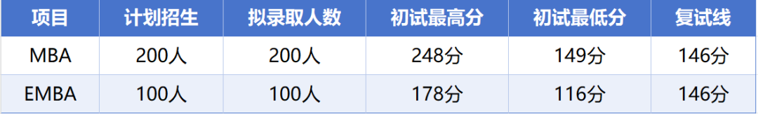MBA项目: 尽管复试线划在146分,但最终录取的最低分为149分,说明即便过线,若复试无绝对优势,压线考生仍可能被淘汰。