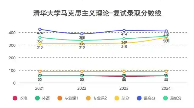 (1)近四年来,各科目分数线趋于平稳状态,总分数线存在轻微波动,2024年分数线最高;意味着当年考题较易,竞争性较大,应更加重视专业课的复习,要早复习,避免走弯路。